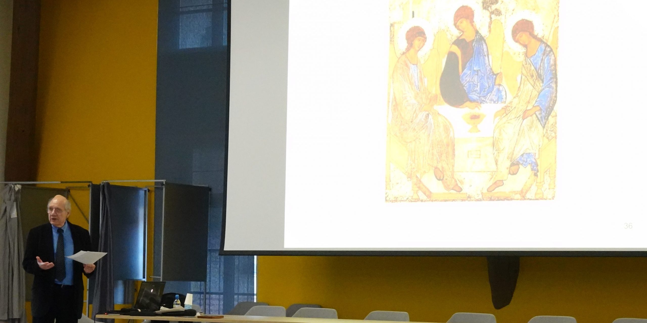 Après avoir évoqué l’histoire de la représentation sacrée, la biographie d’Andréï Roublev et les conditions de réalisation de sa célèbre icône, le conférencier a développé la fonction symbolisante de cette icône qui vient « mobiliser des représentations qui échappent à la conscience ».